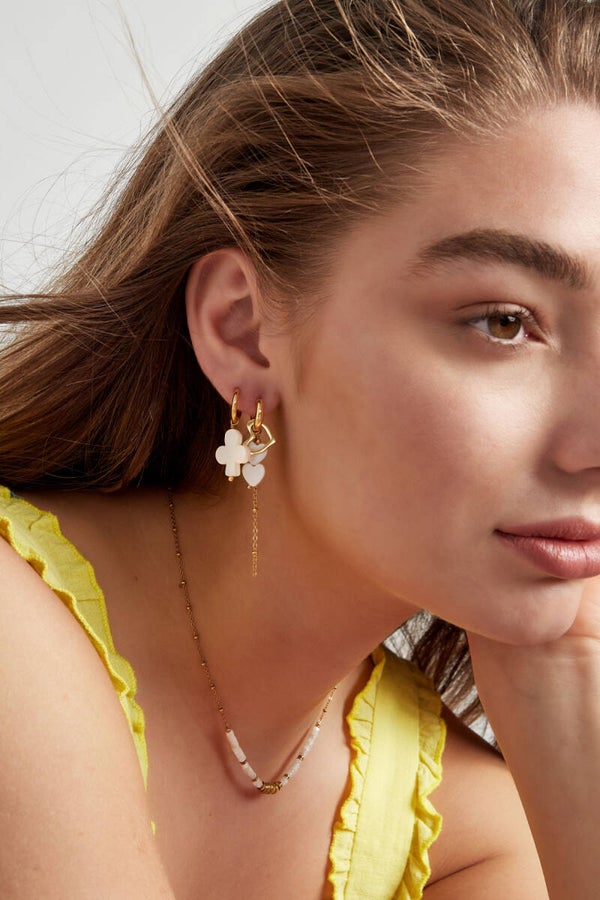 Deze gouden oorbellen met witte klaver bedel zijn zeer geschikt voor elke gelegenheid en kunnen met elke outfit gecombineerd worden, ideaal! De oorbellen zijn gemaakt van Stainless steel en zeeschelp en hebben een afmeting van 3,5 cm.