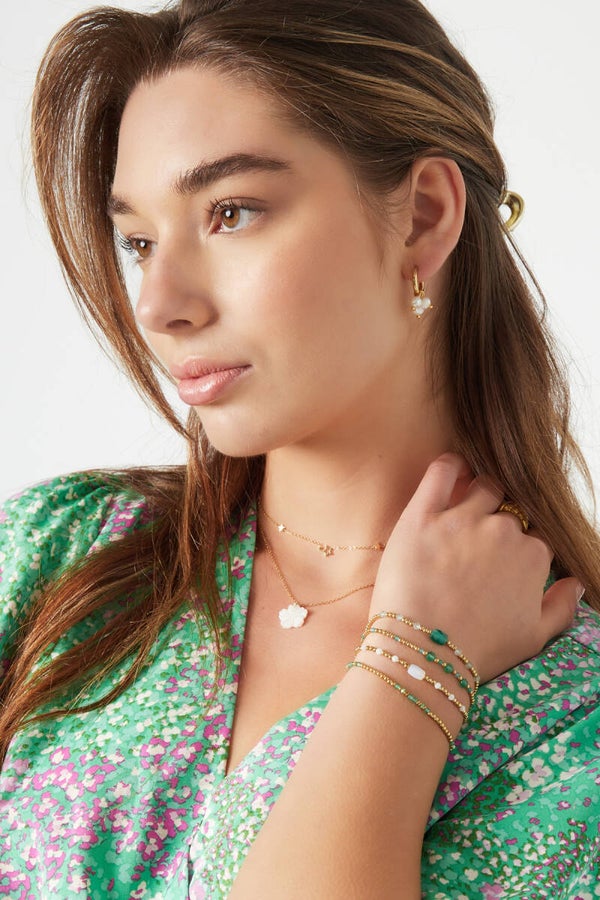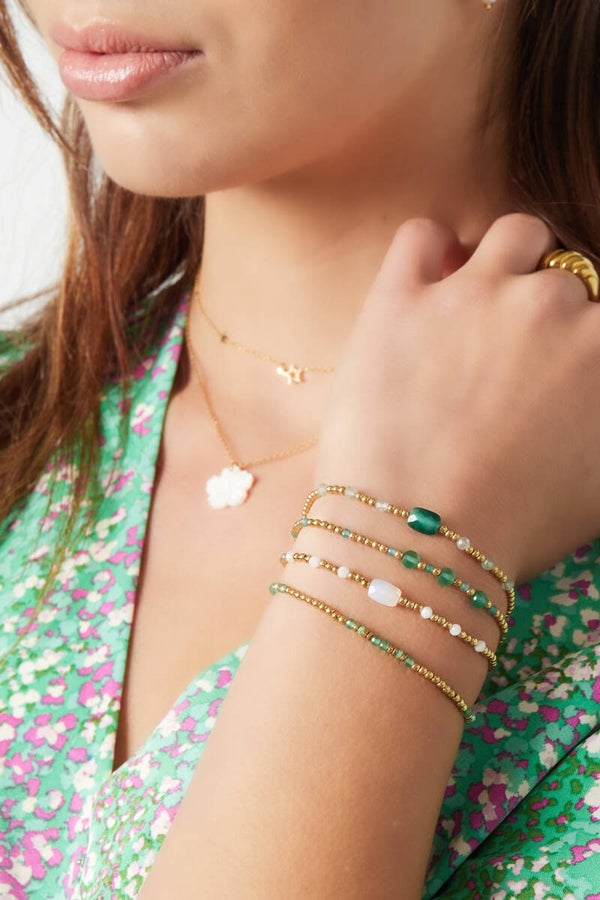 Zoek je nog een leuk armbandje voor bij je outfit? Dan kan dit gekleurde armbandje niet missen! Naast de kleur wit is de armband versierd met gouden kralen gemaakt van roestvrij staal. Het armbandje is geregen met elastische draad, wat maakt dat iedereen dit armbandje past! De stenen kralen zijn gemaakt van witte jade en mooi in vorm gebracht. Dit maakt dat de armband goed gedragen kan worden bij andere aardetinten sieraden, kleding en accessoires.