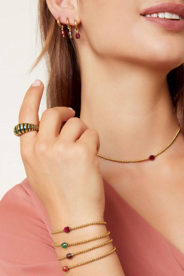 Gouden armband met kraaltjes en een kleurrijke steen in de kleur fuchsia. De armband is 16,5 cm lang.