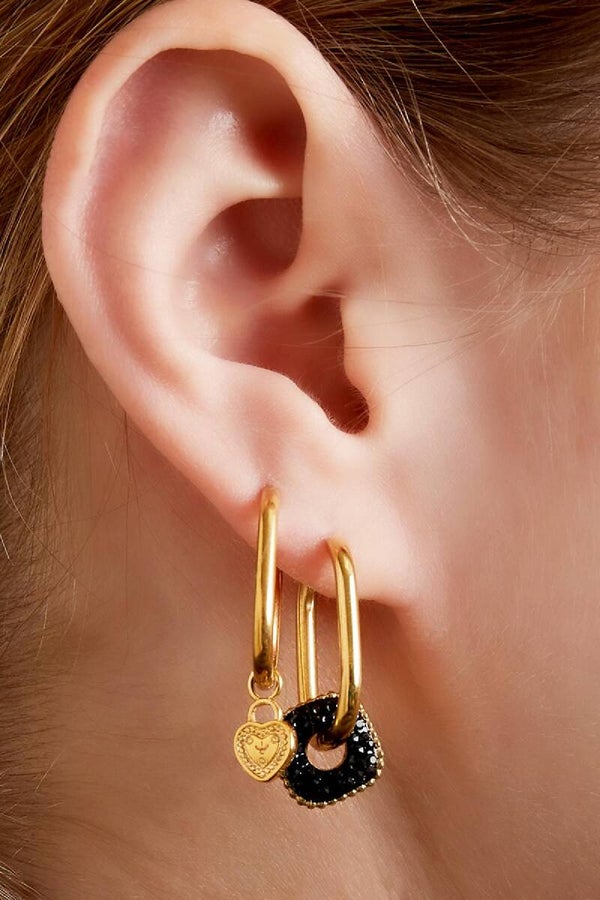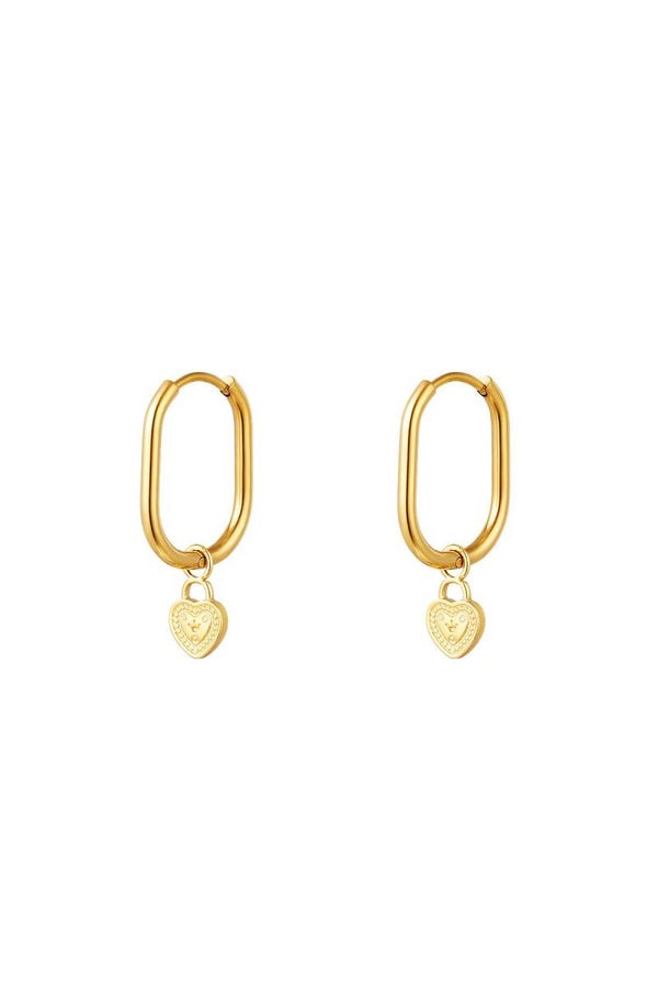 Ovale roestvrijstalen oorbellen met hartbedeltje. Verkrijgbaar in de kleuren goud en zilver.