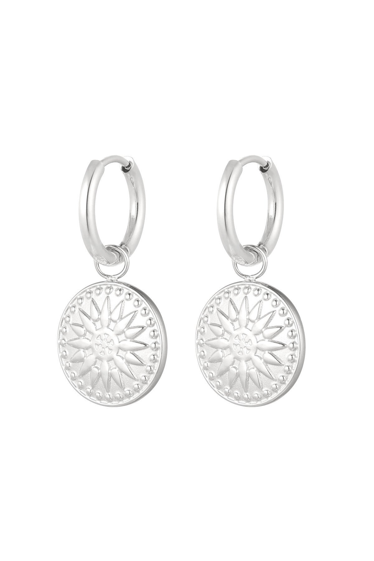 Wauwie! Shop deze leuke speelse zilveren oorbellen met ronde coin met print. De oorbellen zijn super trendy en zijn het perfecte paar statement oorbellen die jij in huis wilt hebben! De oorbellen zijn gemaakt van Stainless steel en hebben een afmeting van 2,5 cm, ideaal te combineren met meerdere kleine oorbellen.