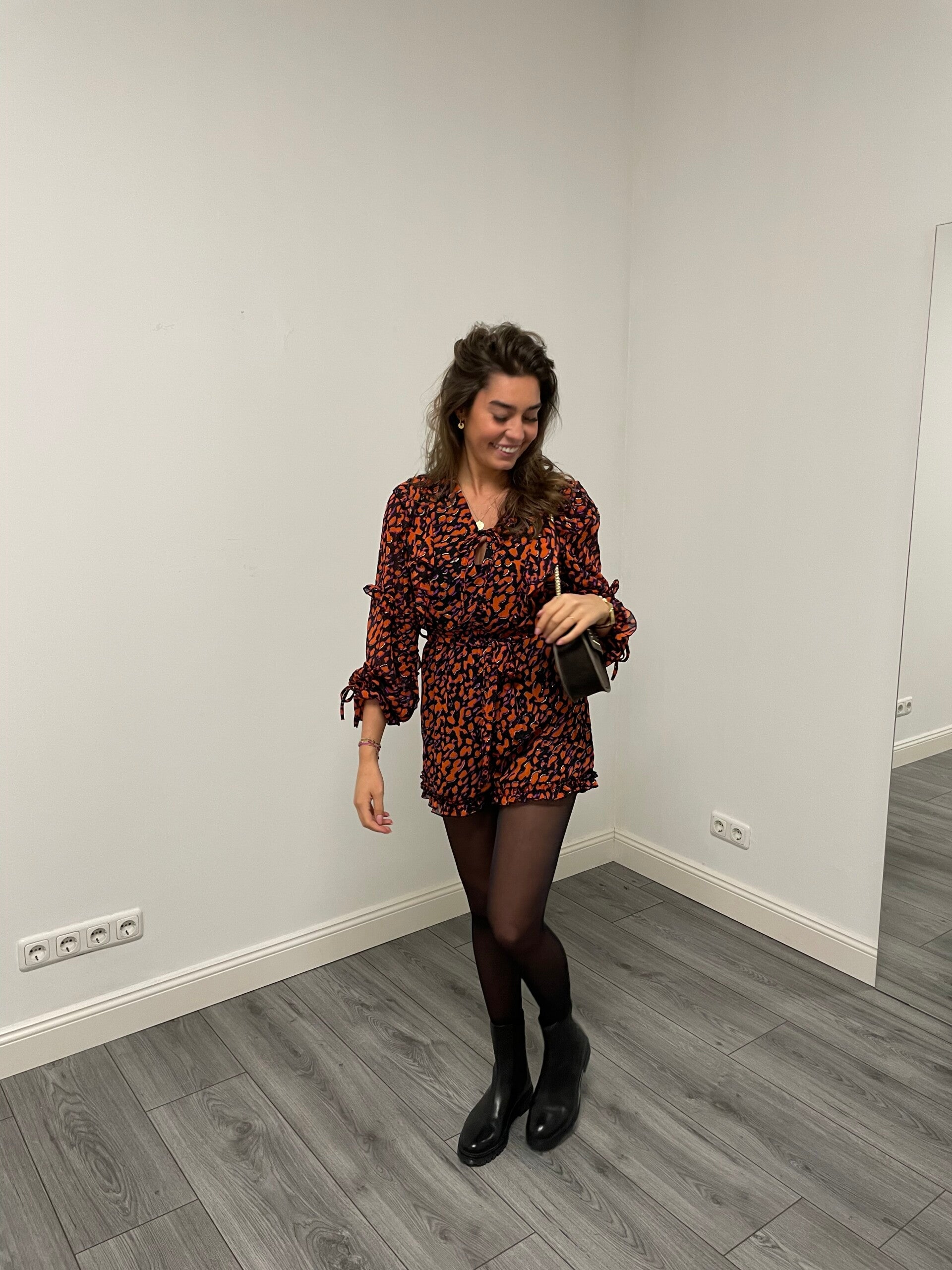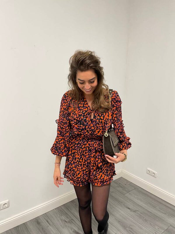Deze playsuit heeft een print met lurex draad, een v-hals met een strikkoord, lange mouwen met een elastische ruches met een strikkoord, een elastische in de taille met een afneembare strikkoord, meerdere lagen met ruches, een open rug met een knoopsluiting en heeft een shortje als uitvoering.
