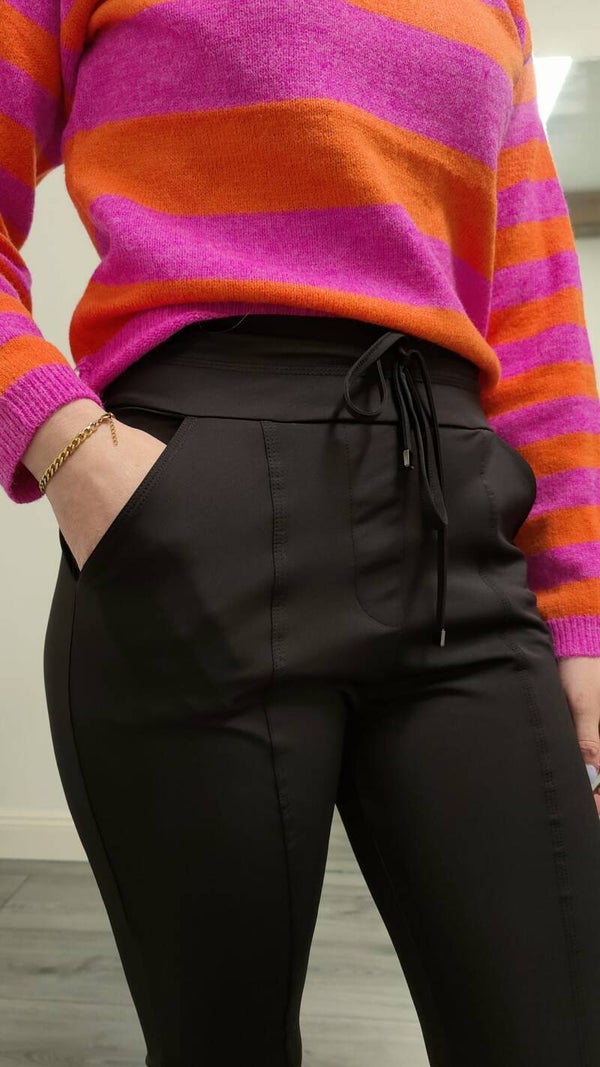 Deze broek heeft een elastische band met strikkoord, split aan de onderkant en twee paspelzakken.