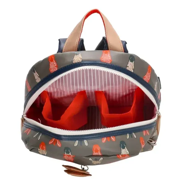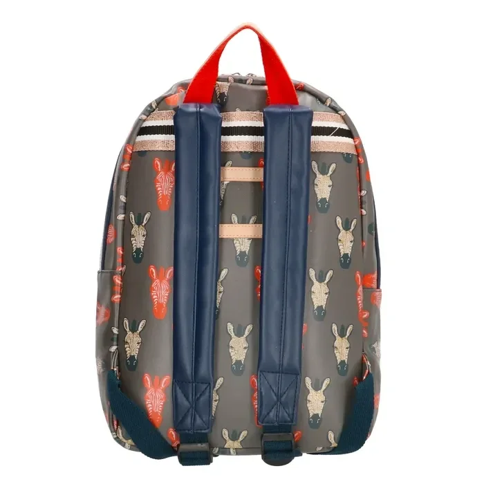 Wat een leuke print! Deze mooie donkergrijze rugzak met oranje- en subtiele gouden glitter Zebra’s erop is toch té schattig! De rugzak heeft voorop een verticale donkerblauwe rits met aan de rits twee hartjes bevestigd. De gehele tas sluit met een stevige blokrits in donkerblauw-wit met dubbele sluiting. De schouderbanden van de tas zijn verstelbaar, zo draag je de tas aan de voor jou perfecte lengte. In de tas bevinden zich 2 drinkbeker vakken en een vrolijke licht roze gestreepte voering. De rugzak is achterop voorzien van het handige naamlabel voor wat persoonlijke informatie. Gaat jouw kleintje veilig op pad met deze rugzak?