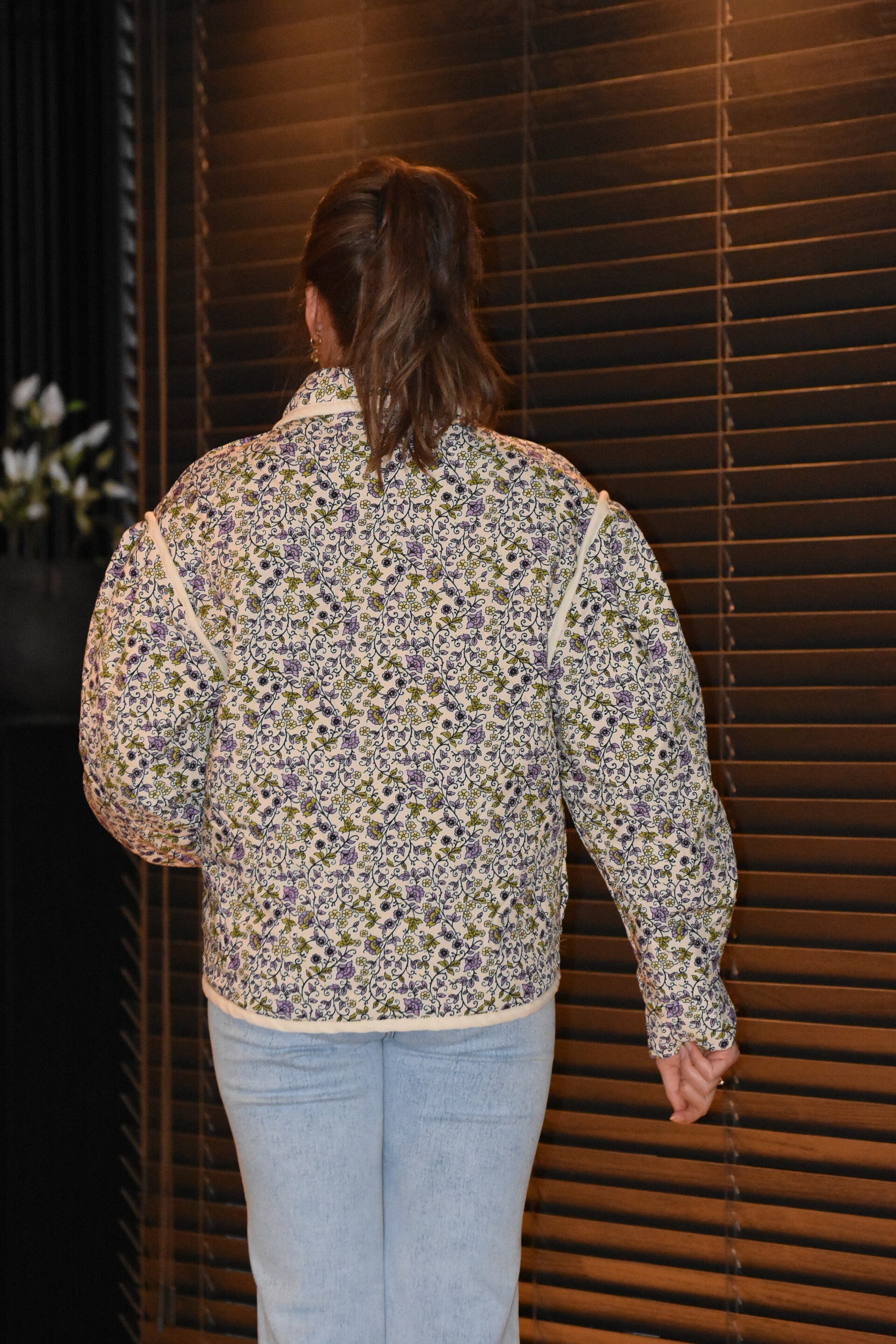 Deze gewatteerde jas met een prachtige paarse bloemen tint is de perfecte combinatie van stijl, comfort en functionaliteit. Of je nu de stad in gaat of een wandeling maakt, deze jack houdt je lekker warm.