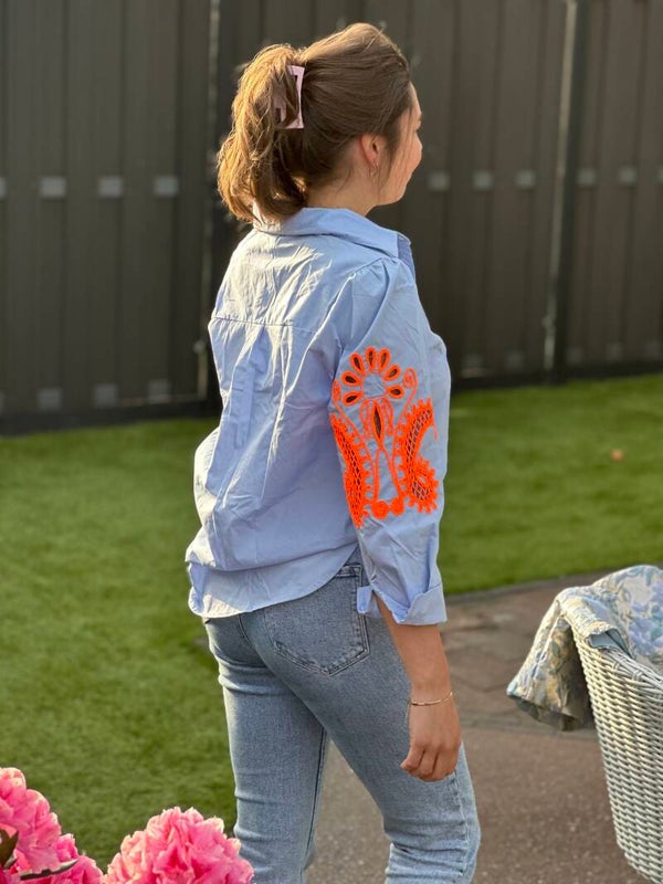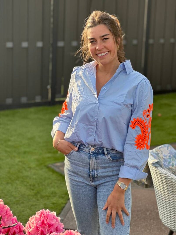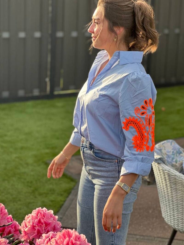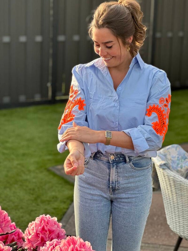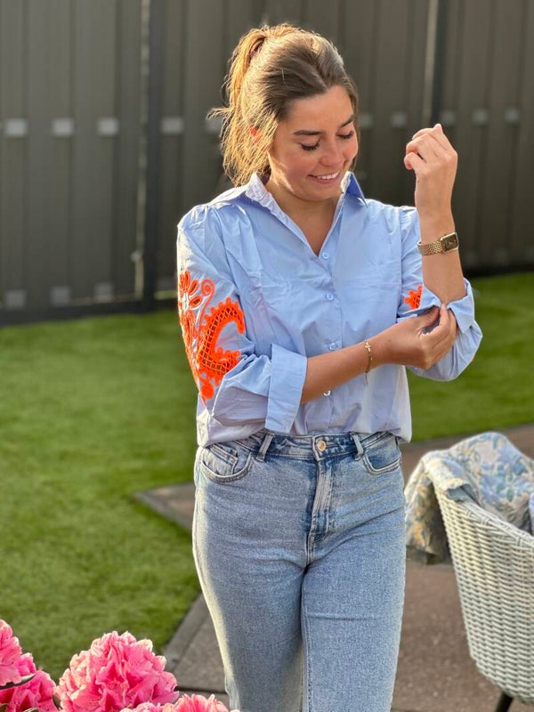 Hele leuke blouse met oranje opdruk op de mouw 🧡