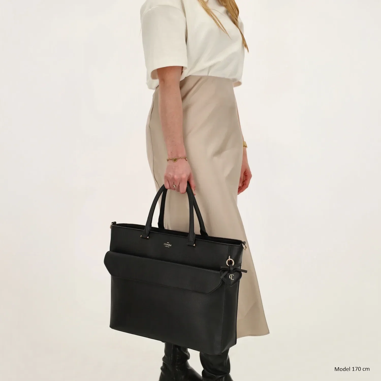 De Charm London Cambridge laptoptas is een stijlvolle shopper en perfect voor werk of studie. De tas is afsluitbaar met een rits en heeft een ruim interieur met slimme opbergmogelijkheden. Binnenin vind je een gewatteerd laptopvak voor een 15,6 inch laptop, een flessenvak, twee insteekvakken, pennenvakken, een ritsvak en een handig haakje om je sleutels aan te bevestigen. Aan de voorkant zit een extra vak met overslag voor spullen die je snel bij de hand wilt hebben. De tas wordt geleverd met een verstelbare en afneembare schouderband en is voorzien van een leuke sleutelhanger als extra detail.