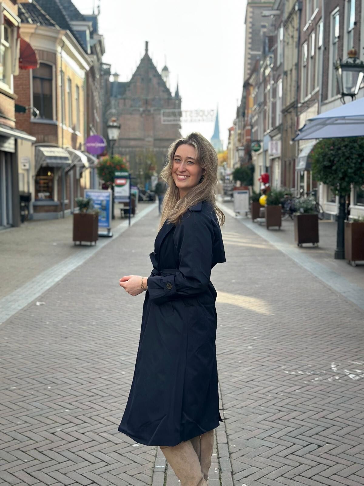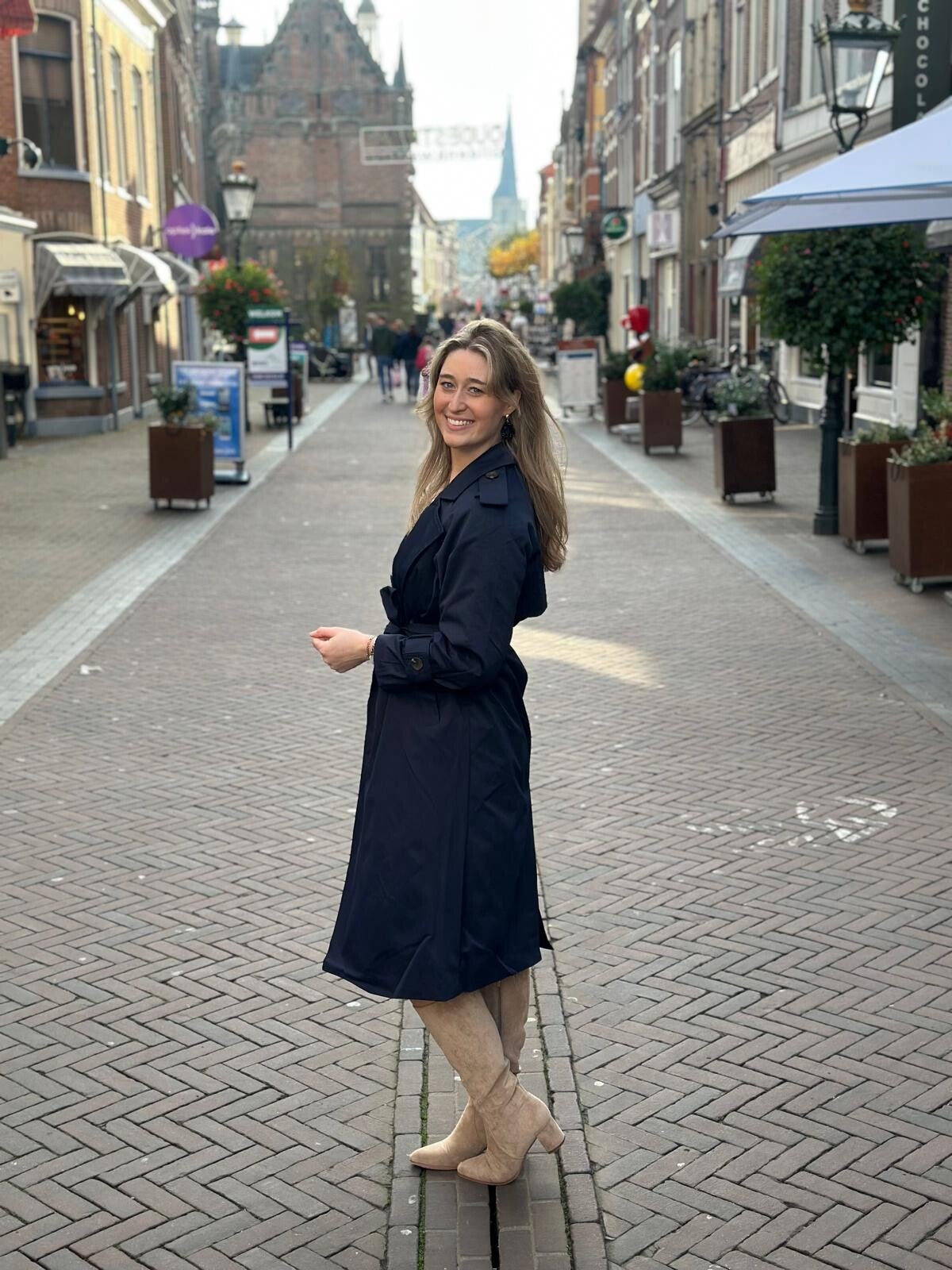Onze navy trenchcoat is de perfecte mix van stijl en functionaliteit. Met zijn flatterende pasvorm, ceintuur in de taille en verfijnde details straalt deze jas pure klasse uit. Draag hem open voor een nonchalante look of gestrikt voor een elegante, vrouwelijke silhouette. Een echte garderobe essential die elk seizoen mee kan.